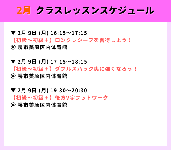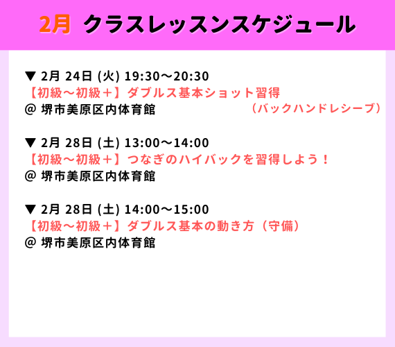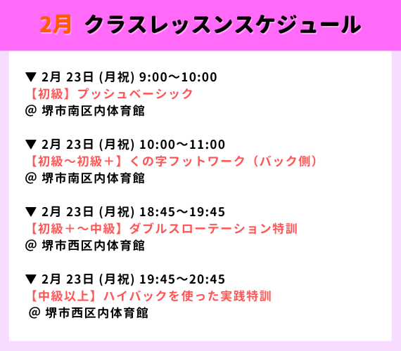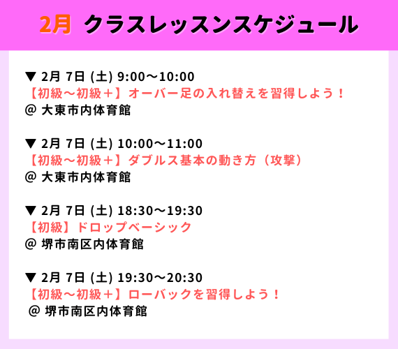 【大阪エリア】2026年2月クラスレッスンスケジュール|大阪・堺・大東バドミントン教室