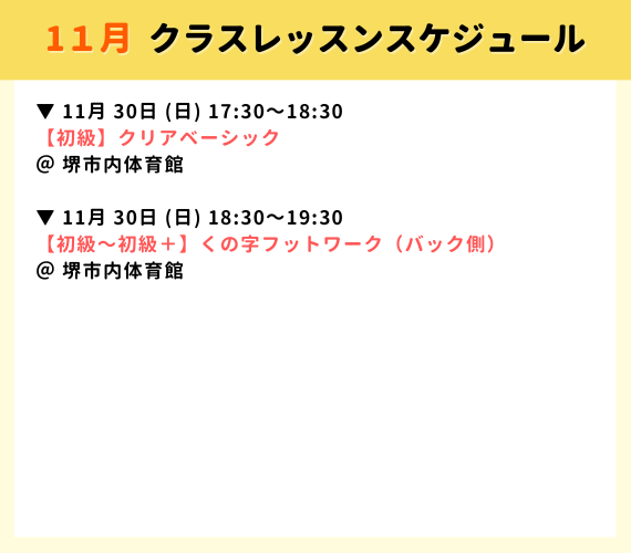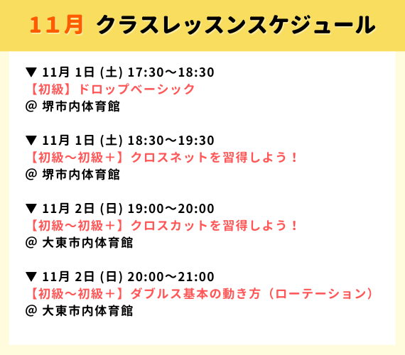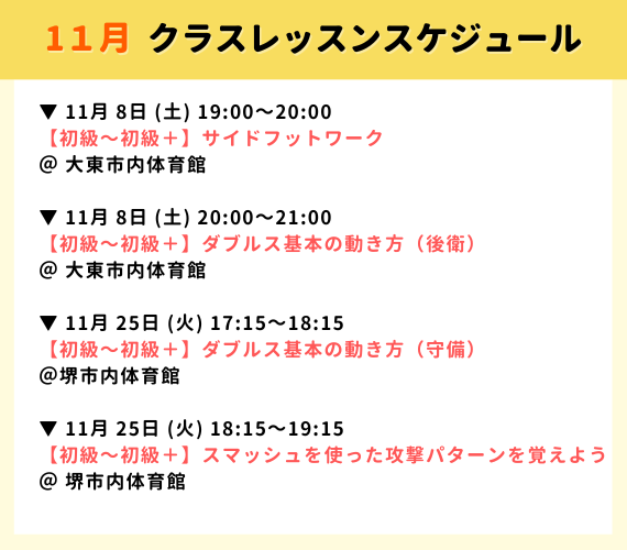 【大阪エリア】2025年11月クラスレッスンスケジュール|大阪・堺・大東バドミントン教室